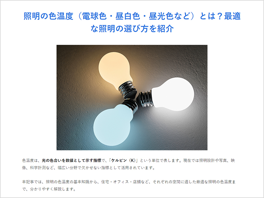 ・「照明の色温度(電球色・昼白色・昼光色など)とは?最適な照明の選び方を紹介 」ページはこちらから
